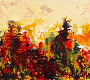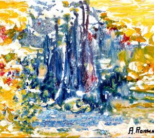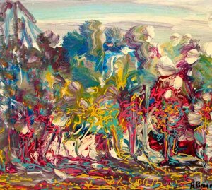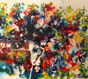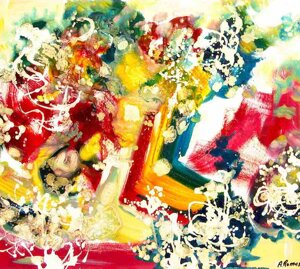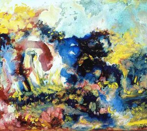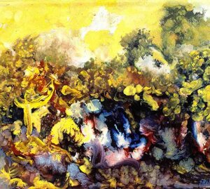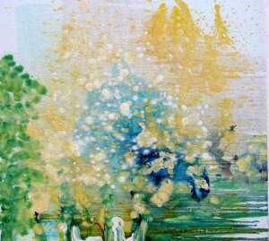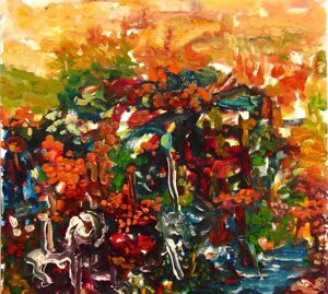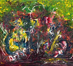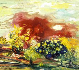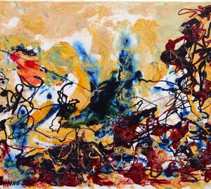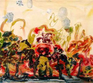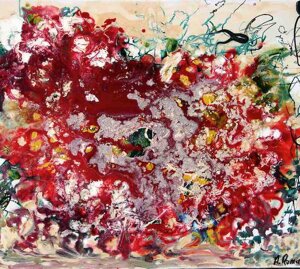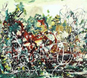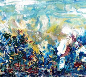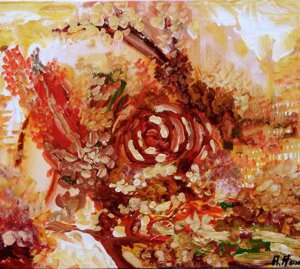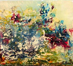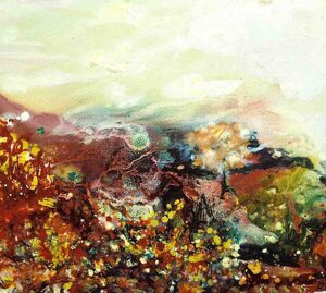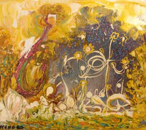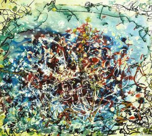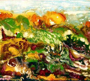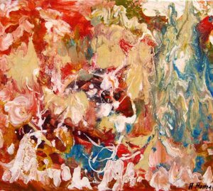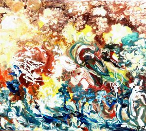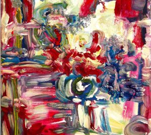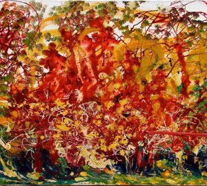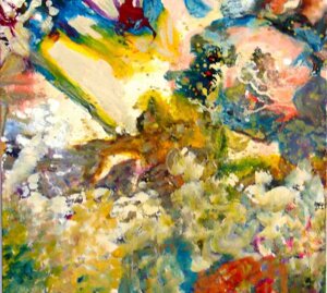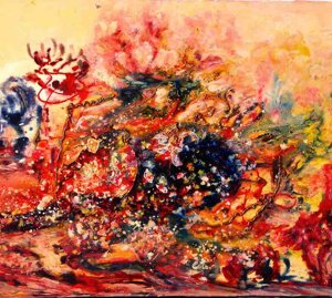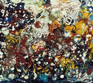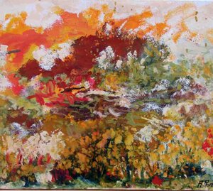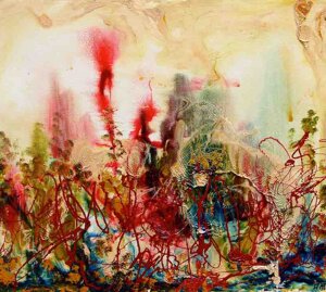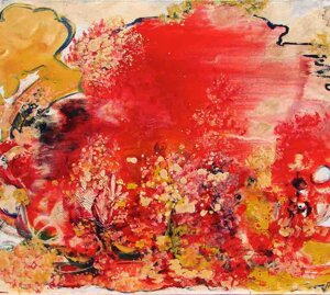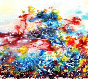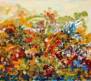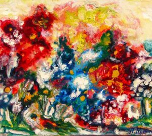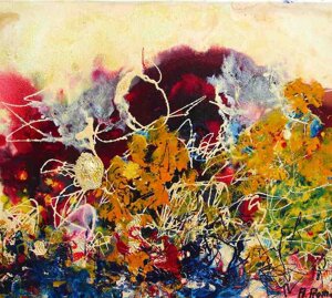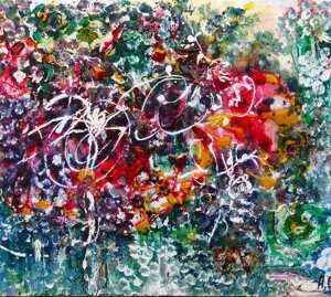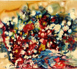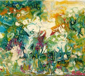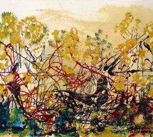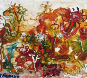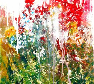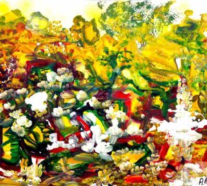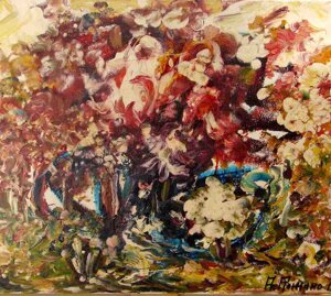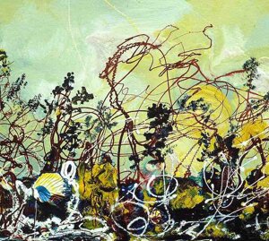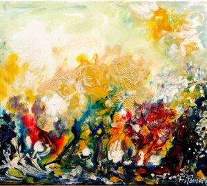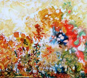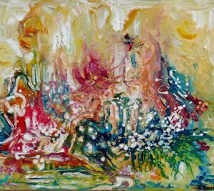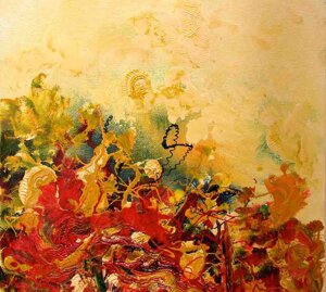 " Tele che tralucono di variopinte polveri di polline su maree floreali in un cespuglioso intrico di fiori, gambi e petali, di corolle dipanate e germogli.